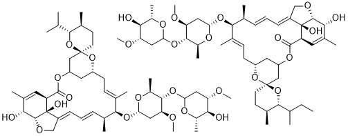 SMILES: | O1[C@]([H])([C@@H](C)CC)[C@@H](C)CC[C@@]21C[C@]1([H])C[C@@]([H])(CC=C(C)[C@H]([C@@H](C)C=CC=C3CO[C@]4([H])[C@@H](C(C)=C[C@@]([H])(C(=O)O1)[C@@]43O)O)O[C@H]1C[C@@H]([C@H]([C@H](C)O1)O[C@H]1C[C@@H]([C@H]([C@H](C)O1)O)OC)OC)O2.O1[C@H](C(C)C)[C@@H](C)CC[C@@]21C[C@]1([H])C[C@@]([H])(CC=C(C)[C@H]([C@@H](C)C=CC=C3CO[C@]4([H])[C@@H](C(C)=C[C@@]([H])(C(=O)O1)[C@@]43O)O)O[C@H]1C[C@@H]([C@H]([C@H](C)O1)O[C@H]1C[C@@H]([C@H]([C@H](C)O1)O)OC)OC)O2 |c:20,28,91,99,t:26,97| |