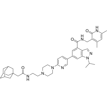 SMILES: | CC(C)N(N=C1)C2=C1C(C(NCC3=C(C)C=C(C)NC3=O)=O)=CC(C4=CC=C(N=C4)N(CC5)CCN5CCNC(CC67C[C@H]8C[C@H](C[C@H](C8)C7)C6)=O)=C2 |