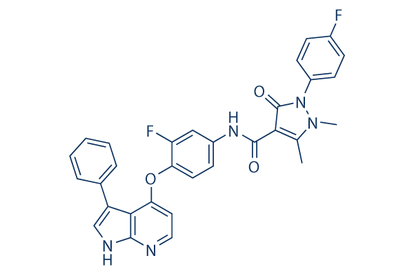 Chemical Name: | N-(3-fluoro-4-(3-phenyl-1H-pyrrolo[2,3-b]pyridin-4-yloxy)phenyl)-2-(4-fluorophenyl)-1,5-dimethyl-3-oxo-2,3-dihydro-1H-pyrazole-4-carboxamide |
