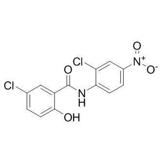 Description: | Niclosamide(BAY2353) is used for the treatment of most tapeworm infections by inhibiting DNA replication.Niclosamide (< 5 μM) dose dependently inhibits STAT3-mediated luciferase reporter activity with IC50 of 0.25 μM in HeLa cells. Niclosamide(< 2 μM) dose dependently inhibits the phosphorylation of STAT3 in Du145 cells. Niclosamide (1 μM) inhibits the EGF-induced nuclear translocation of STAT3 in Du145 cells. Niclosamide(< 2 μM) dose dependently inhibits the transcription of STAT3 downstream genes in Du145 cells. Niclosamide(< 10 μM) dose dependently induces G0/G1 arrest and apoptosis of Du145 cancer cells. Niclosamide(< 7.5 μM) promotes Frizzled1 endocytosis, downregulates Dishevelled-2 protein, and inhibits Wnt3A-stimulated beta-catenin stabilization and LEF/TCF reporter activity in U2OS cells. Niclosamide inhibits the TNF-induced NF-κB reporter activity in a dose- and time-dependent manner in U2OS cells. Niclosamide(125 nM) inhibits NF-κB activation induced by p65, IKKα, IKKβ, IKKγ, and TAK1 in U2OS cells. Niclosamide(< 500 nM) completely block the time- and dose-dependent TNFα-induced alteration of the NF-κB-DNA complex in HL-60 cells. Niclosamide(< 10 nM) inhibits constitutive NF-κB activation in U266 cells. Niclosamide inhibits TNF-induced degradation of IκBα and relocation of p65 in a dose- and time-dependent manner in HL-60, Molm13, or AML primary cells. Niclosamide(500 nM) decreases TNF-induced NF-κB-dependent gene products involved in cell survival in HL-60 cells. Niclosamide dose dependently inhibits the growth and induces robust apoptosis of AML cells associated with decreased Mcl-1 and XIAP levels and increased intracellular ROS levels. |