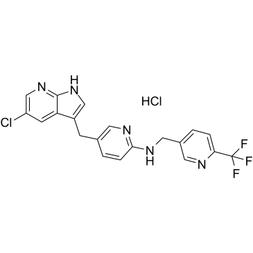 SMILES: | FC(C1=CC=C(CNC2=NC=C(CC3=CNC4=NC=C(Cl)C=C43)C=C2)C=N1)(F)F.[H]Cl |