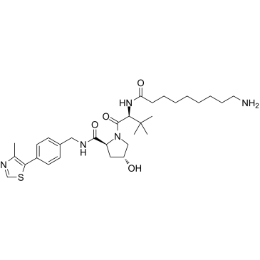 SMILES: | O=C(N(C[C@H](O)C1)[C@@H]1C(NCC2=CC=C(C(SC=N3)=C3C)C=C2)=O)[C@H](C(C)(C)C)NC(CCCCCCCCN)=O |