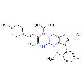 SMILES: | CC(C)OC1=C(C=CC(=C1)N2CCN(CC2)C)NC3=NC=C4C(=N3)C(=C(S4)CO)C5=C(C=CC(=C5)F)OC |
