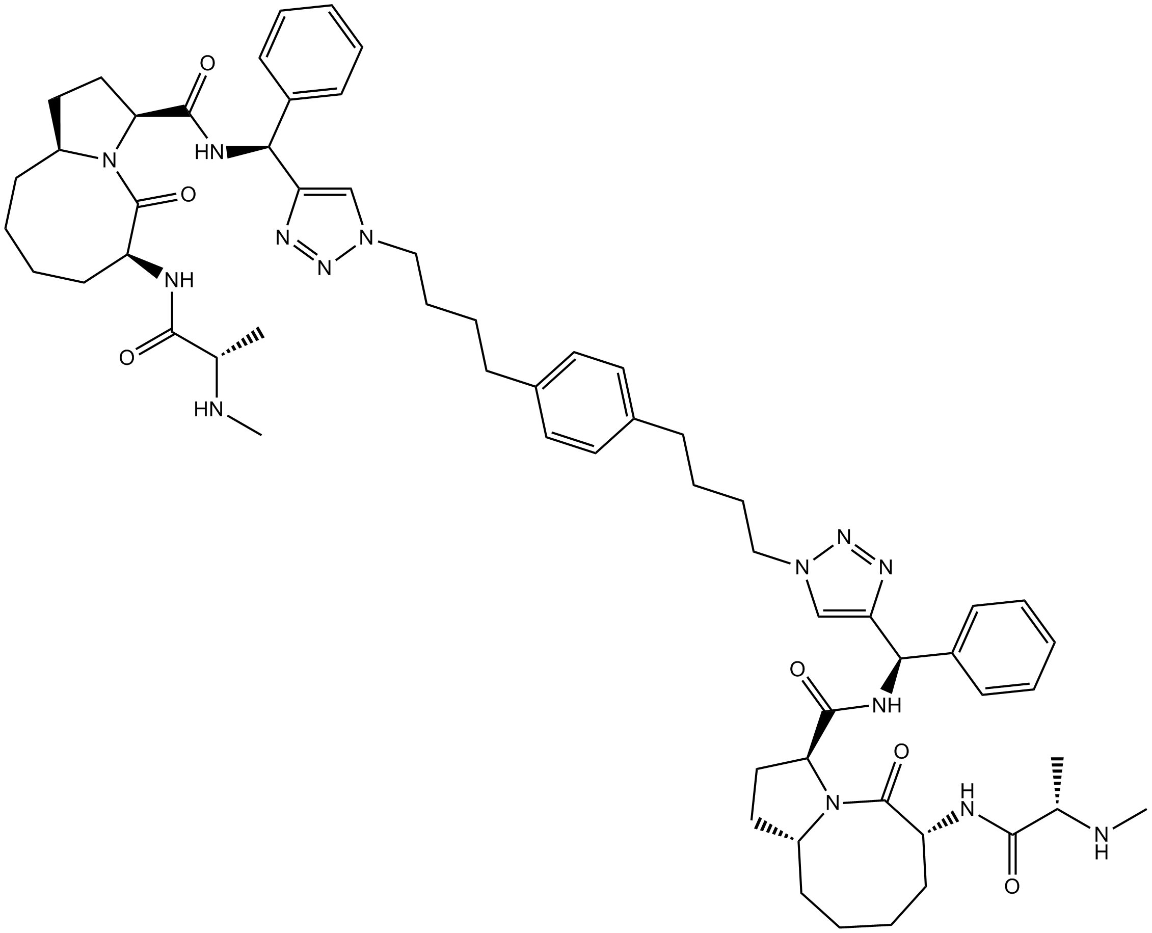 Chemical Name: | (3S,6R,10aR)-6-((S)-2-(methylamino)propanamido)-N-((R)-(1-(4-(4-(4-(4-((S)-((3S,6S,10aS)-6-((S)-2-(methylamino)propanamido)-5-oxodecahydropyrrolo[1,2-a]azocine-3-carboxamido)(phenyl)methyl)-1H-1,2,3-triazol-1-yl)butyl)phenyl)butyl)-1H-1,2,3-triazol-4-yl)( |