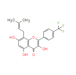 SMILES: | C(C/C=C(\C)/C)1=C(O)C=C(O)C2C(=O)C(O)=C(C3=CC=C(C(F)(F)F)C=C3)OC1=2 |