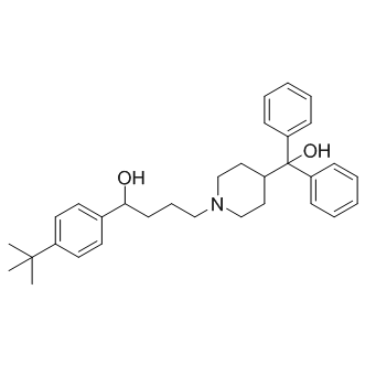 SMILES: | OC(C1CCN(CCCC(c2ccc(C(C)(C)C)cc2)O)CC1)(c1ccccc1)c1ccccc1 |