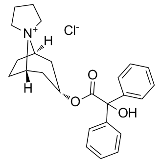 Description: | Trospium Chloride is a competitive muscarinic cholinergic receptor antagonist.Trospium chloride is an antimuscarinic agent indicated for the treatment of overactive bladder with symptoms of urge urinary incontinence, urgency, and urinary frequency. Trospium has pharmacologic properties that are distinct from other antimuscarinic agents. After oral administration, absorption of the hydrophilic trospium chloride is slow and incomplete. Peak plasma concentrations (Cmax) of approximately 4 ng/mL are reached 4-5 hours after administration of a 20 mg immediate-release preparation. The mean bioavailability is approximately 10% and decreases by concomitant food intake (to a mean of 26% of the fasting area under the plasma concentration-time curve [AUC]). Trospium chloride displays dose proportional increases in AUC and Cmax after a single dose within the clinically relevant dose range (20-60 mg). The mean volume of distribution is approximately 350-800 L. |