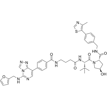 SMILES: | O=C(NCCCC(=O)N[C@@H](C(C)(C)C)C(=O)N1C[C@H](O)C[C@H]1C(=O)NCC1C=CC(C2SC=NC=2C)=CC=1)C1C=CC(C2C3=NN=CN3C(NCC3OC=CC=3)=NC=2)=CC=1 |