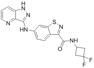 Chemical Name: | 6-((1H-pyrazolo[4,3-b]pyridin-3-yl)amino)-N-(3,3-difluorocyclobutyl)benzo[d]isothiazole-3-carboxamide |