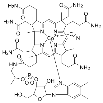 SMILES: | N#[C-][Co+3]123([N]4=CN(C(OC(CO)C5OP6([O-])=O)C5O)C7=C4C=C(C)C(C)=C7)[N]8=C9C(CCC(N)=O)C(CC(N)=O)(C)C8(C)C(C(CC(N)=O)C%10(CCC(NCC(C)O6)=O)C)[N-]1C%10=C(C)C(C(CCC(N)=O)C%11(C)C)=[N]2C%11=CC%12=[N]3C(C(CC(N)=O)(C)C%12CCC(N)=O)=C9C |