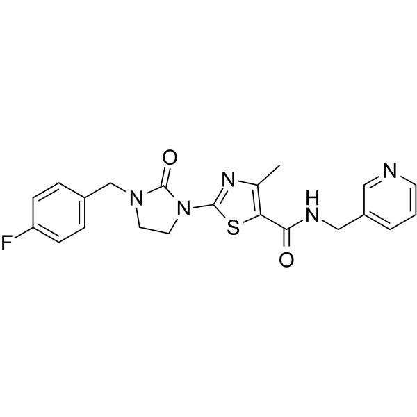 SMILES: | S1C(C(NCC2=CC=CN=C2)=O)=C(C)N=C1N1C(=O)N(CC2=CC=C(F)C=C2)CC1 |