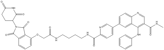 Chemical Name: | 6-(6-((4-(2-((2-(2,6-Dioxopiperidin-3-yl)-1,3-dioxoisoindolin-4-yl)oxy)acetamido)butyl)carbamoyl)pyridin-3-yl)-N-methyl-4-(phenylamino)quinoline-3-carboxamide |