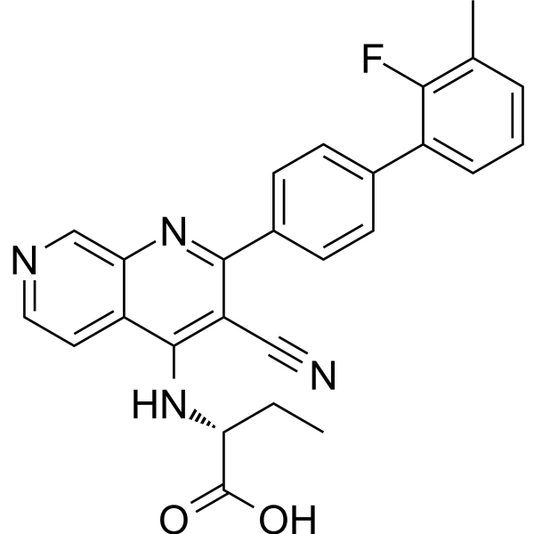 SMILES: | CC[C@@H](NC1=C(C#N)C(C2=CC=C(C3=CC=CC(C)=C3F)C=C2)=NC4=CN=CC=C14)C(O)=O |