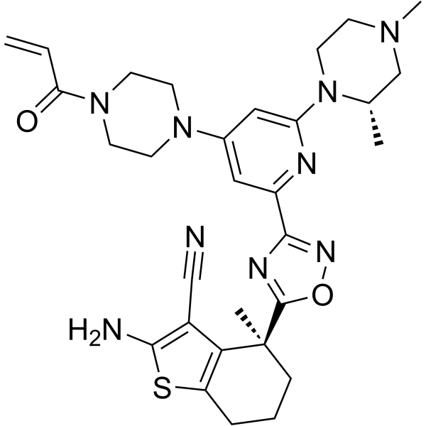 SMILES: | C12CCC[C@@](C3ON=C(C4=NC(N5CCN(C)C[C@@H]5C)=CC(N5CCN(C(=O)C=C)CC5)=C4)N=3)(C)C=1C(C#N)=C(N)S2 |