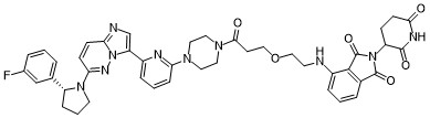 SMILES: | FC1=CC=CC(=C1)[C@H]1CCCN1C1C=CC2=NC=C(C3=CC=CC(=N3)N3CCN(C(CCOCCNC4=CC=CC5C(N(C(C=54)=O)C4C(NC(CC4)=O)=O)=O)=O)CC3)N2N=1 |