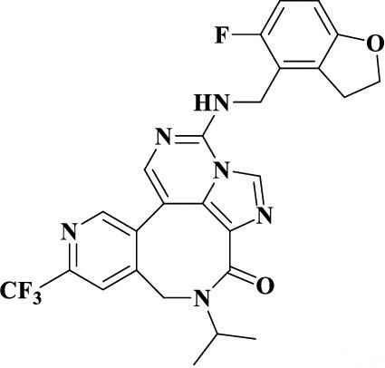 SMILES: | FC1C=CC2=C(CCO2)C=1CNC1=NC=C2C3=CN=C(C(F)(F)F)C=C3CN(C(C3=C2N1C=N3)=O)C(C)C |
