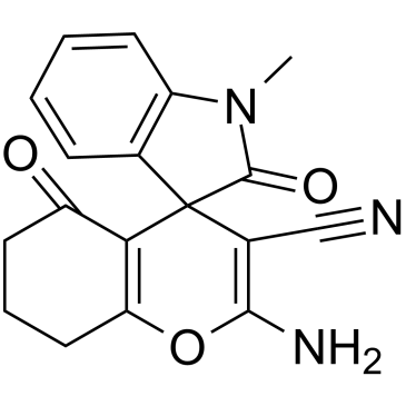 Synonyms: | MuRF1-IN-1;Oprea1_487101;RSC004160;STK863604;ST071760;1'-Methyl-2',5-dioxo-5,6,7,8-tetrahydro-2-aminospiro[4H-1-benzopyran-4,3'-indoline]-3-carbonitrile;2'-amino-3'-cyano-1-methyl-1,3,5',6',7',8'-hexahydro-2,5'-dioxospiro[2H-indol-3,4'-(4'H)-chromene];2-amino-1'-methyl-2',5-dioxo-1',2',5,6,7,8-hexa-hydrospiro[chromene-4,3'-indole]-3-carbonitrile;2-amino-1'-methyl-2',5-dioxo |