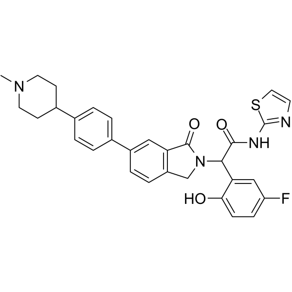 Synonyms: | 2H-Isoindole-2-acetamide, α-(5-fluoro-2-hydroxyphenyl)-1,3-dihydro-6-[4-(1-methyl-4-piperidinyl)phenyl]-1-oxo-N-2-thiazolyl-;JBJ-09-063 |