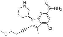 Chemical Name: | (S)-4-chloro-2-(4-methoxybut-1-yn-1-yl)-3-methyl-1-(piperidin-3-yl)-1H-pyrrolo[2,3-b]pyridine-6-carboxamide |