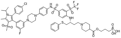 SMILES: ClC1C([H])=C([H])C(=C([H])C=1[H])C1=C(C2C([H])=C(C([H])=C(C=2[H])N2C([H])([H])C([H])([H])N(C3C([H])=C([H])C(=C([H])C=3[H])N([H])S(C3C([H])=C([H])C(=C(C=3[H])S(C(F)(F)F)(=O)=O)N([H])[C@@]([H])(C([H])([H])SC3C([H])=C([H])C([H])=C([H])C=3[H])C([H])([H])C([H])([H])N3C([H])([H])C([H])([H])C([H])(C(=O)OC([H])([H])C([H])([H])C([H])([H])P(=O)(O[H])O[H])C([H])([H])C3([H])[H])(=O)=O)C([H])([H])C2([H])[H])F)C(=C(C([H])([H])[H])N1C([H])(C([H])([H])[H])C([H])([H])[H])S(C([H])([H])[H])(=O)=O
