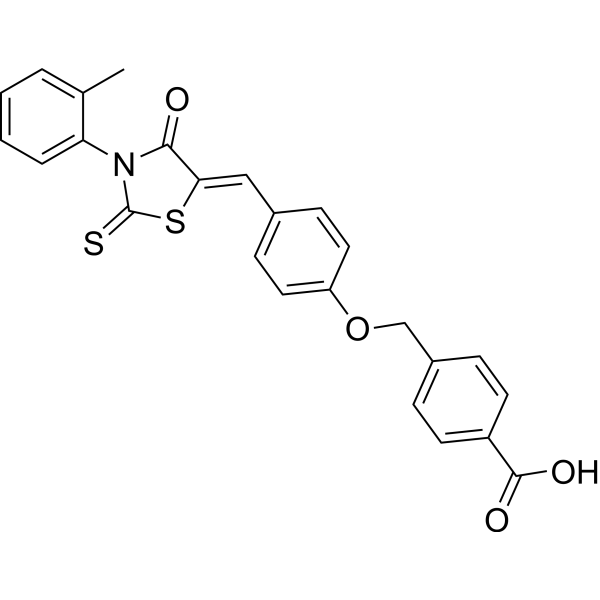 Synonyms: | JHN76359;(Z)-4-((4-((4-Oxo-2-thioxo-3-(o-tolyl)thiazolidin-5-ylidene)methyl)phenoxy)methyl)benzoic acid;Slingshot inhibitor D3 |