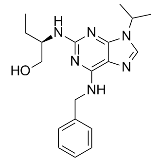 Roscovitine (Seliciclib, CYC202, R-roscovitine) is a potent and selective CDK inhibitor for Cdc2/cyclin B, CDK2/cyclin A, CDK2/cyclin E and CDK5/p53 with IC50 of 0.65 μM, 0.7 μM, 0.7 μM and 0.16 μM, respectively.