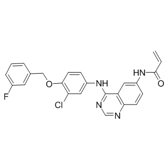 AV-412(MP-412) is a potent dual inhibitor of EGFR and ErbB2(IC50=19 nM) tyrosine kinases, including the mutant EGFR(L858R IC50=0.51 nM, T790M IC50=0.79 nM); inhibits autophosphorylation of EGFR and ErbB2 with IC(50) of 43 and 282 nM, respectively.