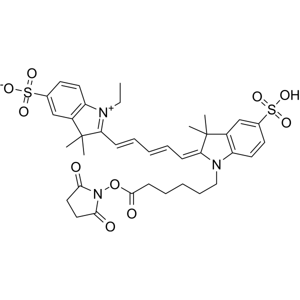 Cy5-SE (Cy5 NHS Ester) is a reactive dye for the labeling of amino-groups in peptides, proteins, and oligonucleotides. This dye requires small amount of organic co-solvent (such as DMF or DMSO) to be used in labeling reaction. This reagent is ideal for very cost-efficient labeling of soluble proteins, as well as all kinds of peptides and oligonucleotides. This reagent also works well in organic solvents for small molecule labeling. Excitation (nm):649, Emission (nm): 670.