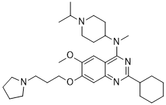 UNC0737 is a negative control of UNC0638 and the N-methyl analog of UNC0638. UNC0737 was designed to eliminate the hydrogen bond interaction seen in the G9a-UNC0224 cocrystal structure between Asp1083 of G9a and the secondary amino group at the 4-position of UNC0224's quinazoline ring3. UNC0737 was >300-fold less potent than UNC0638 in G9a and GLP biochemical assays. As expected, UNC0737 was a poor inhibitor of G9a (IC50 = 5,000 ± 200 nM (n = 2)) and GLP (IC50 > 10,000 nM (n = 2)) in the SAHH-coupled assays.