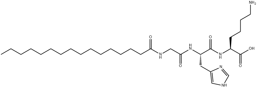 Pal-GHK is a form of the extracellular matrix-derived peptide GHK containing palmitic acid, which allows it to penetrate the stratum corneum to the epidermal and dermal skin layers. Pal-GHK increases collagen synthesis in skin fibroblasts. It has been used with the zwitterionic surfactant C12 dodecyldimethylamine oxide (C12DMAO) to study self-assembly of the mixture into aggregates, ribbons, and nanobelts. Pal-GHK has also been used as an internal standard for the quantification of pal-KTTKS in anti-wrinkle creams by LC-MS/MS