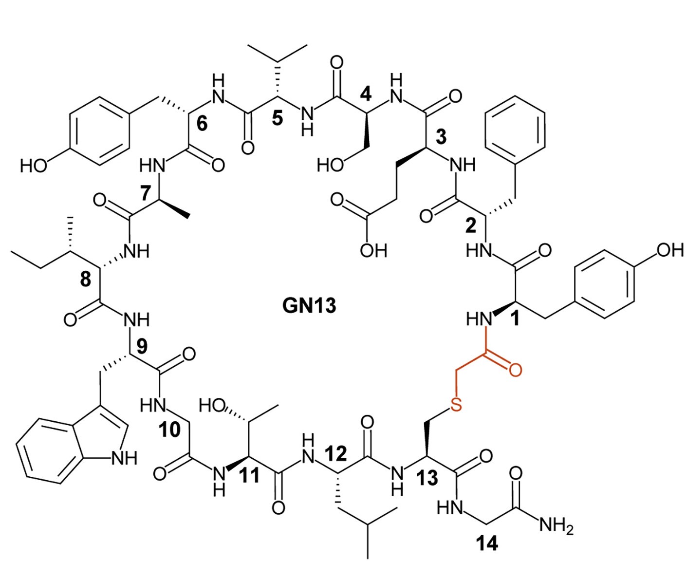 GN13 is a potent, selective, and cell-permeable inhibitor of Gαs, with a strong binding affinity for the active, GTP-bound state of Gαs (KD = 0.19 μM). Its high selectivity and ability to penetrate cells make it a powerful tool for studying Gαs signaling in both basic research and potential therapeutic applications.
