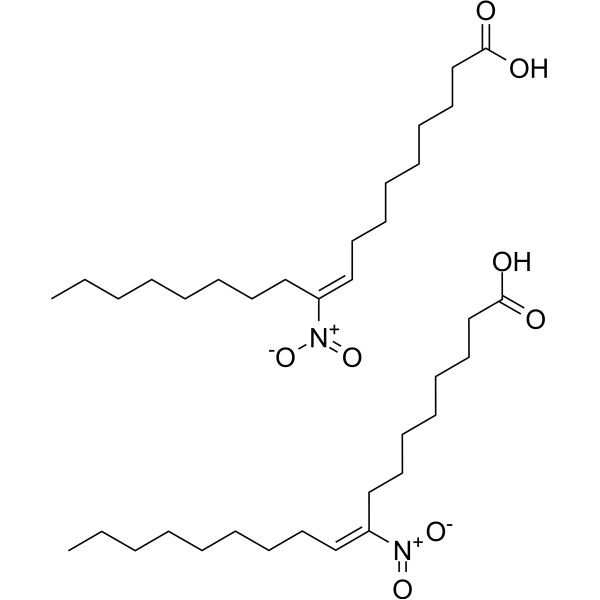 9(10)-Nitrooleate (9(10)-Nitrated oleic acid) is a nitrated derivative of Oleic acid (HY-N1446). 9(10)-Nitrooleate can activate PPAR (PPARα, PPARβ/δ, and PPARγ), promoting fat formation and glucose uptake, inhibiting the function of neutrophils and platelets, and can be used in lipid metabolism and inflammation research.