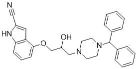 DPI-201-106 is a cardioselective inhibitor of the TTX-resistant h1 Na channel inactivation. DPI-201-106 inhibits the L-type calcium current, and inward and delayed rectifier potassium currents.