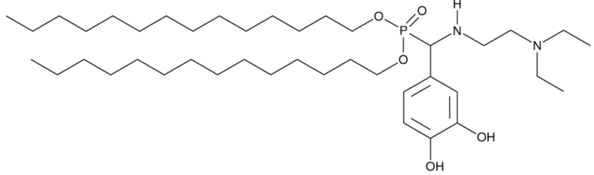 Lipid catechol is a lipid that contains an α-aminophosphonate group, two 14-carbon acyl chains, and a catechol ring that forms a covalent bond with boronic acid-containing compounds to form lipid prodrug nanoassemblies (LPNA).1 LPNAs composed of lipid catechol conjugated to phenylboronic acid-modified ciprofloxacin (CIP-PBA) inhibit the formation of, and disrupt preformed, S. aureus biofilms and eradicate staphylococci in a mouse model of peritoneal S. aureus infection. LPNAs composed of lipid catechol conjugated to bortezomib (BTZ) reduce tumor growth and increase survival in a 4T1 murine mammary carcinoma model.