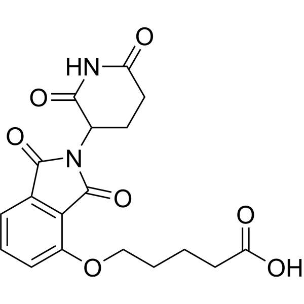 Pomalidomide 4'-alkylC5-acid is a synthesized E3 ligase ligand-linker conjugate that incorporates the Pomalidomide based cereblon ligand and a PEG linker used in PROTAC technology.