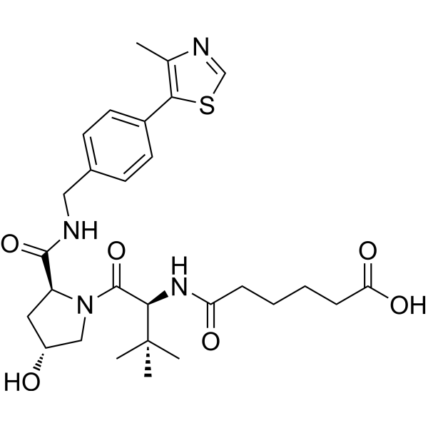 VH032-linker 5 is a derivative of the proteolysis-targeting chimera technology (PROTAC) for PROTAC research and development; by incorporating an E3 ligase ligand and an alkyl C4 linker with terminal carboxylic acid, it is ready for conjugation to a target protein ligand.