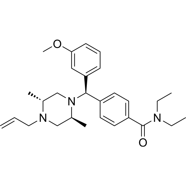 SNC80 (NIH 10815) is a potent, highly selective and non-peptide δ-opioid receptor agonist with a Ki of 1.78 nM and an IC50 of 2.73 nM. SNC80 also selectively activates μ-δ heteromer in HEK293 cells with an EC50 of 52.8 nM. SNC80 shows antinociceptive, antihyperalgesic and antidepressant‐like effects. SNC80 has the potential for multiple headache disorders treatment.