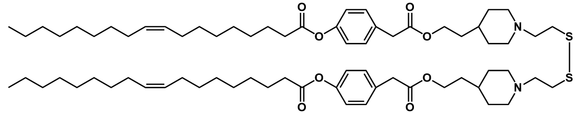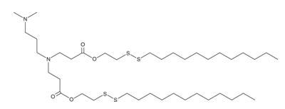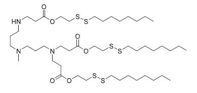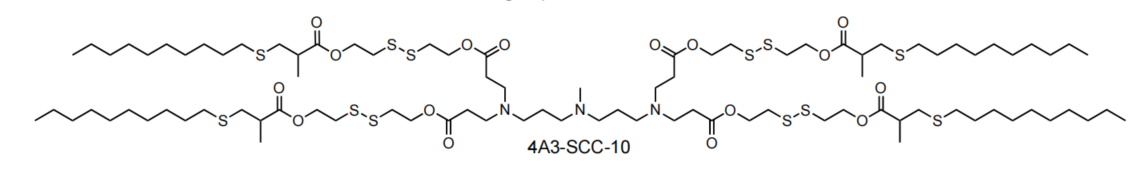 4A3-SCC-10 is a disulfide bond-containing biodegradable ionizable cationic lipid (pKa = 6.22) that has been used in the generation of lipid nanoparticles (LNPs) for the delivery of mRNA in vitro and in vivo. LNPs containing 4A3-SCC-10 and encapsulating a Cy5-RNA reporter have improved endosomal escape ability over Cy5-RNA-encapsulated LNPs containing 4A3-SC-10, which does not contain disulfide bonds, in HeLa cells. Intravenous administration of LNPs containing 4A3-SCC-10 and encapsulating an mRNA luciferase reporter selectively accumulate in mouse liver.