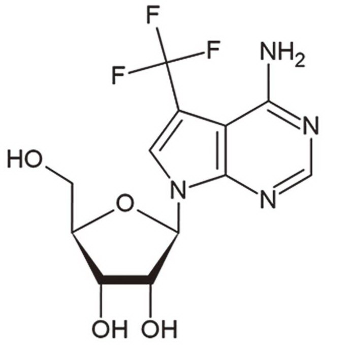 TFMT (Trifluoromethyl-tubercidin) inhibits methyltransferase 1 (MTr1) through interaction at its S-adenosyl-l-methionine binding pocket to restrict influenza virus replication. TFMT is active against influenza A virus (IAV) and influenza B virus (IBV) but not hazara virus (HAZV) or Issyk-Kul virus (ISKV).