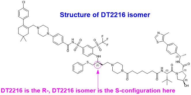 DT2216-isomer is an isomer of DT2216. Compared to DT-2216, DT2216-isomer has a S-chiral carbon which links to the nitrogen atom of the aniline group. DT2216 is a potent and selective Bcl-xL-specific degrader. DT2216 is highly active against Bcl-xL-dependent T cell lymphomas. DT2216 selectively killed various Bcl-xL-dependent TCL cells including MyLa cells in vitro. In vivo, DT2216 alone was highly effective against MyLa TCL xenografts in mice without causing significant thrombocytopenia or other toxicity. Furthermore, DT2216 combined with ABT199 (a selective Bcl-2 inhibitor) synergistically reduced disease burden and improved survival in a TCL PDX mouse model dependent on both Bcl-2 and Bcl-xL.