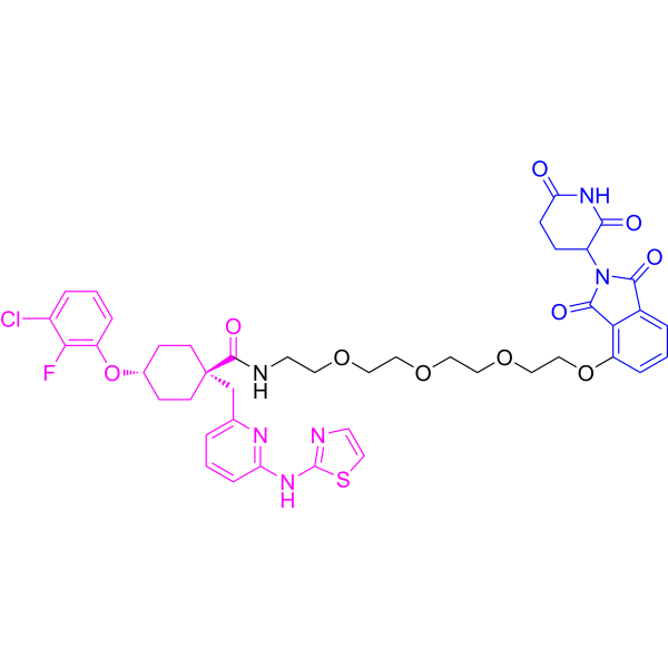 SK2188 is a highly efficient and selective PROTAC degrader targeting AURKA (DC50 = 3.9 nM). SK2188 induces DNA damage and cell apoptosis. SK2188 indirectly degrades MYCN, inhibits tumor cell proliferation, and provides insights into the study of MYCN-amplified neuroblastoma.