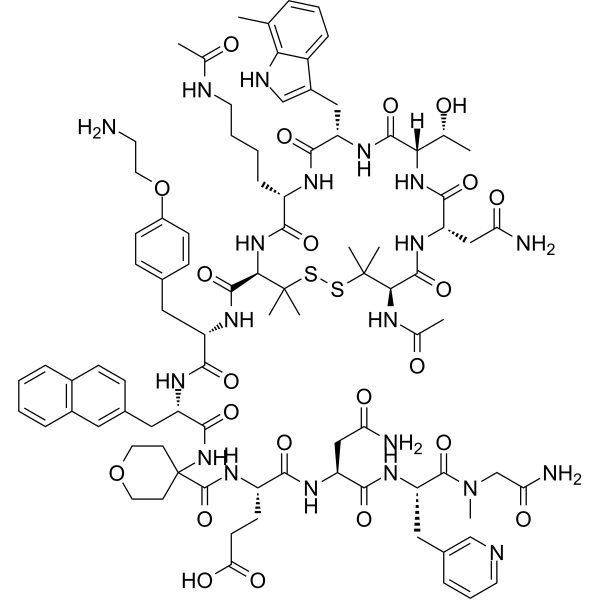 Icotrokinra (JNJ-77242113, JNJ-2113, PN-235) is an orally available and selective antagonist of the IL-23 receptor. It also inhibits IL-23–induced STAT3 phosphorylation in peripheral blood mononuclear cells with an IC50 of 5.6 pM and suppresses IL-23–induced IFN-γ production in NK cells with an IC50 of 18.4 pM. It also exhibits anti-inflammatory activity in a TNBS-induced colitis model in rats and holds potential for studying psoriasis, psoriatic arthritis, and inflammatory bowel disease.