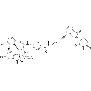 MD-224 is a first-in-class and highly potent small-molecule human murine double minute 2 (MDM2) degrader based on the proteolysistargeting chimera (PROTAC) concept. MD-224 induces rapid degradation of MDM2 at concentrations <1 nM in human leukemia cells, and achieves an IC50 value of 1.5 nM in inhibition of growth of RS4;11 cells. MD-224 has the potential to be a new class of anticancer agent.