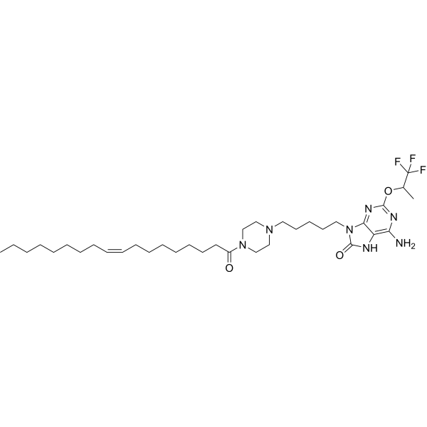 Enpatoran (M5049) is an orally active and dual TLR7/8 inhibitor with IC50s of 11.1 nM and 24.1 nM in HEK293 cells, respectively. Enpatoran can block both innate and adaptive autoimmunity. Enpatoran is inactive against TLR3, TLR4 and TLR9. Enpatoran (M5049) can block molecule synthetic ligands and natural endogenous RNA ligands. Enpatoran (M5049) inhibits cytokine release, causing great potency in pharmacokinetic/pharmacodynamic properties.
